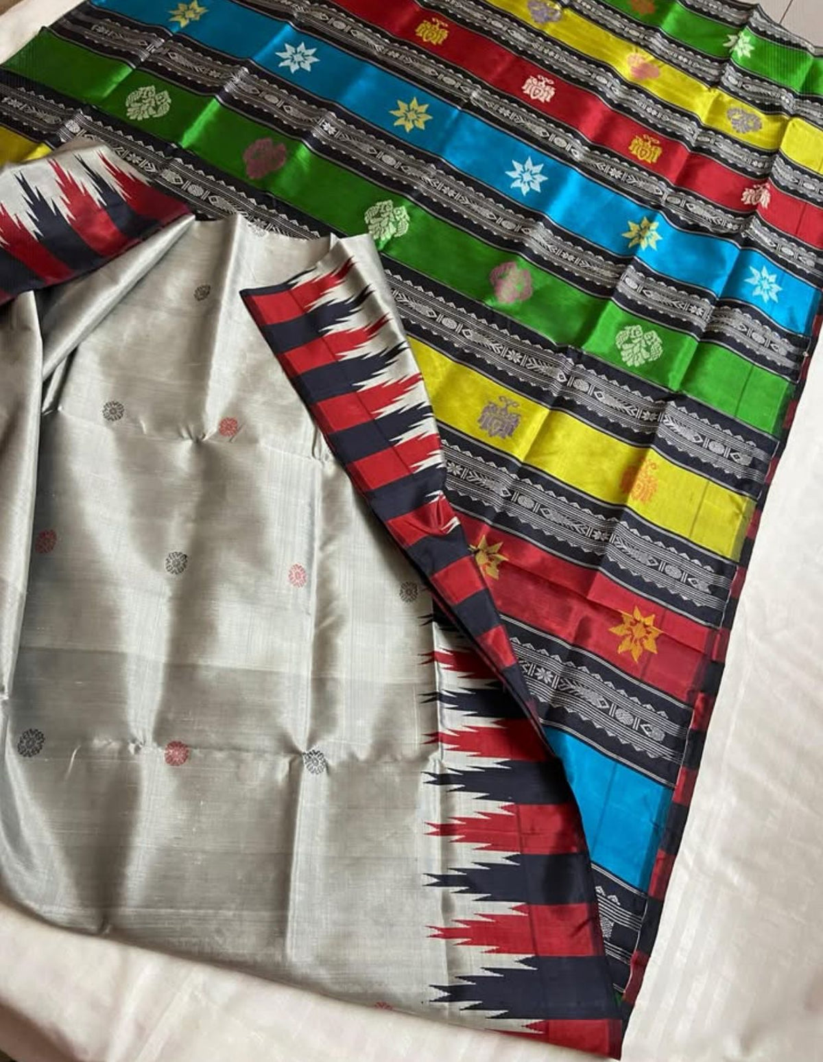 Unleash your inner diva with this Grey Handcrafted Pure Silk Double Pallu Berhampuri Saree, a perfect harmony of tradition and...