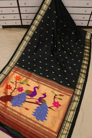 Wrap yourself in the regal allure of this Pure Silk Handwoven Black Paithani, a masterpiece that celebrates centuries of Maharashtrian...