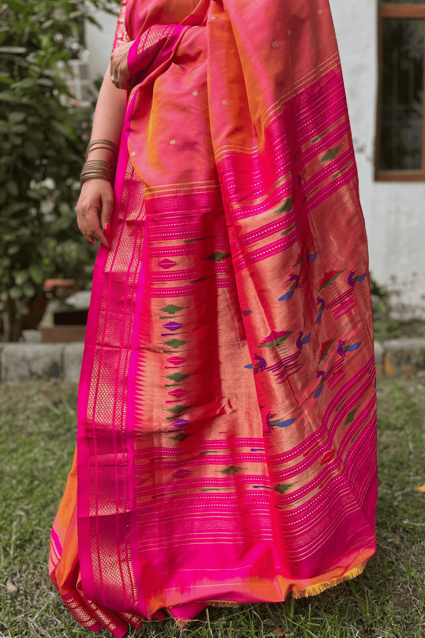 An exclusive handcrafted treasure from the Paithani collection, this dual-tone pure silk saree features a magnificent traditional pallu adorned with...