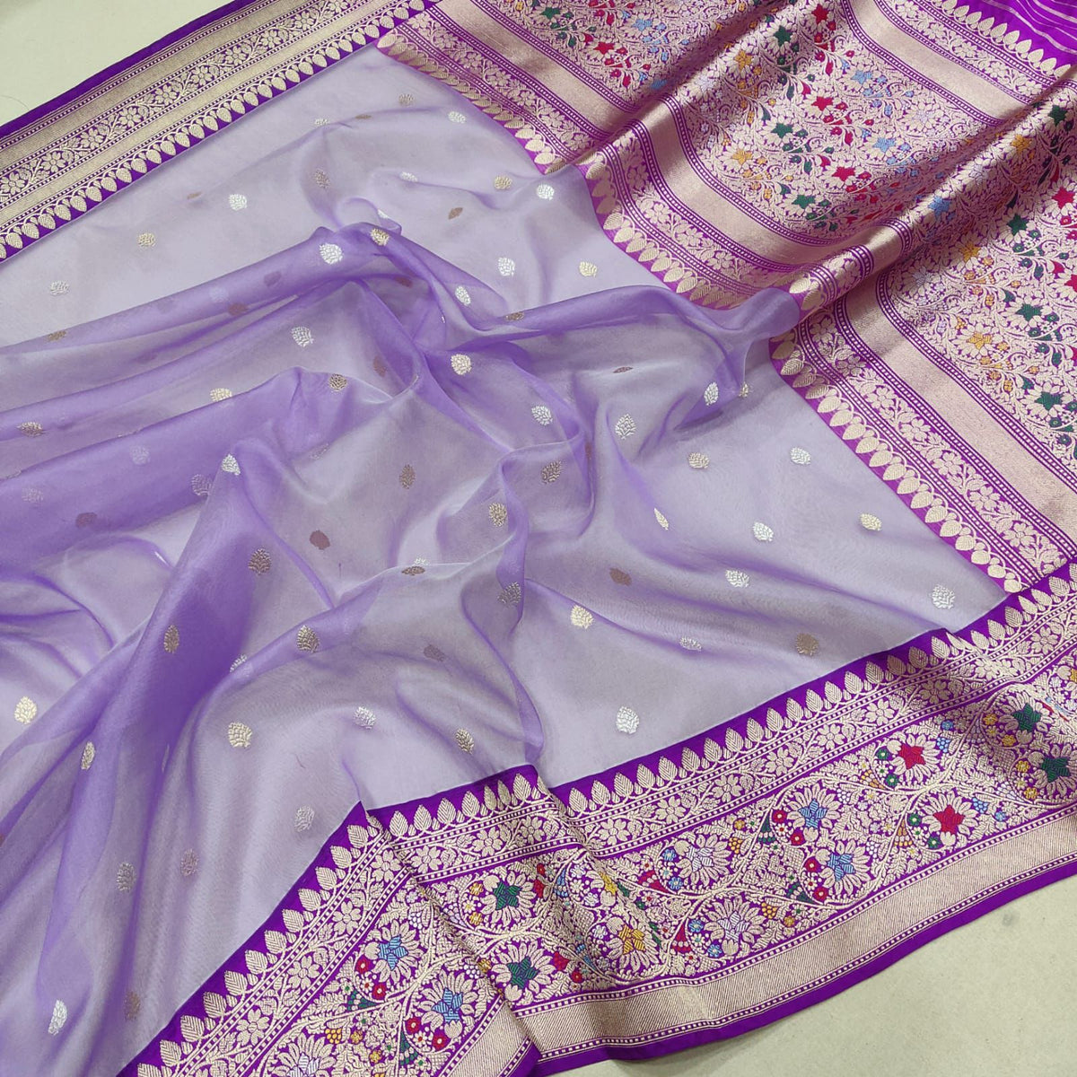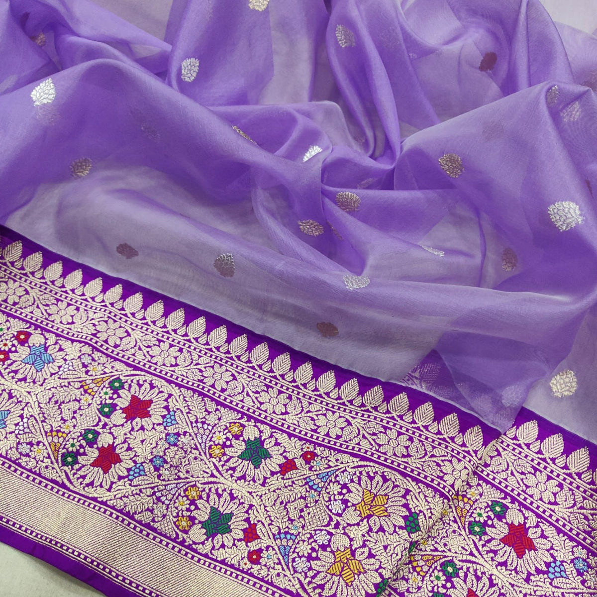 From the Eternal Weaves of Banaras, the Aarohi Kora Banarasi Saree is an exclusive handwoven treasure crafted in pure kora...