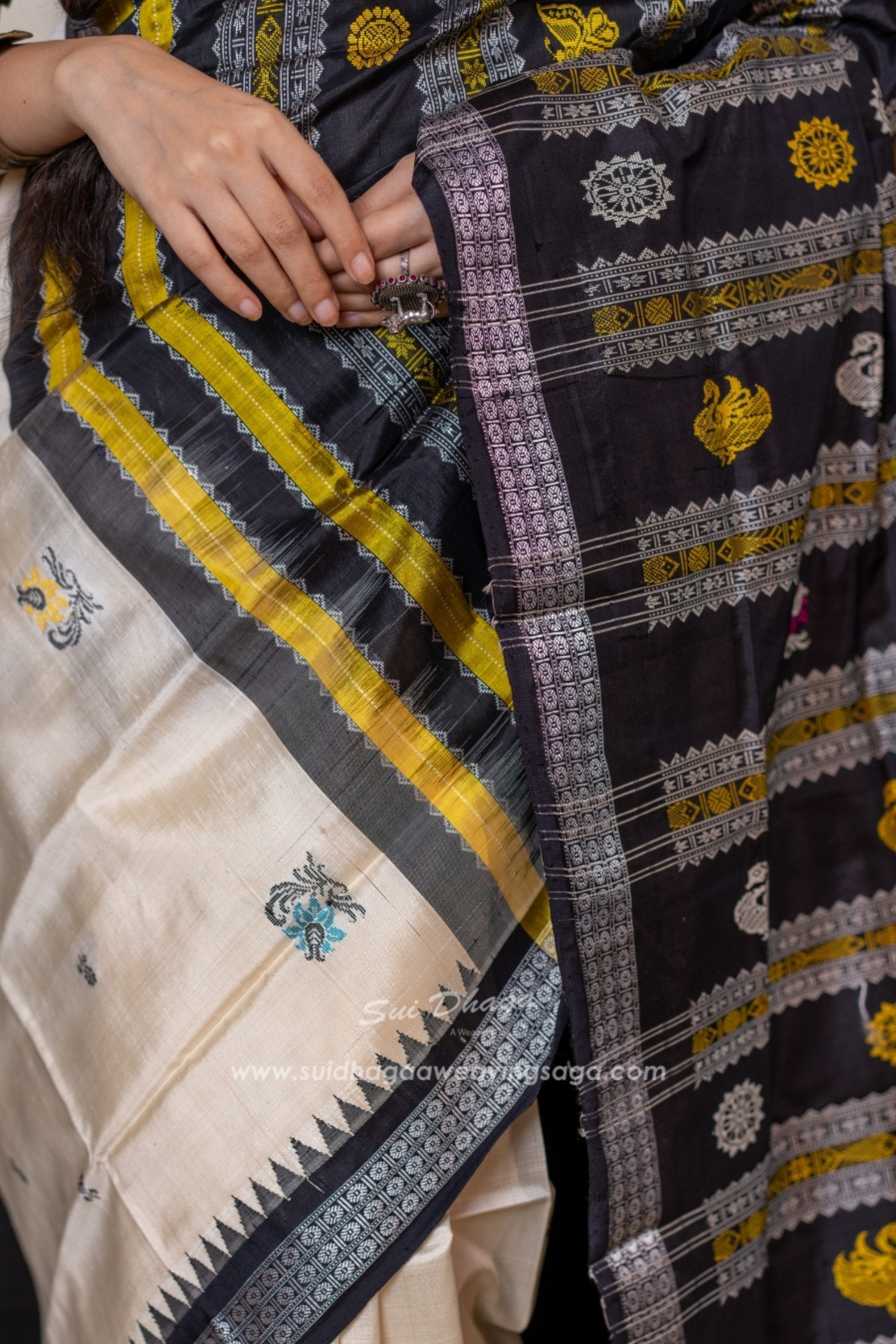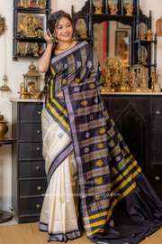 An exclusive handcrafted creation from the Berhampuri collection, this pure silk saree stands out with its refined monochrome palette and distinctive double pallu design. Blending contemporary elegance with the traditional essence of Berhampuri weaving, each detail reflects artistry and sophistication. Perfect for festive occasions, cultural gatherings, and modern celebrations, this saree embodies heritage reimagined, making it a timeless addition to any heirloom-worthy collection.