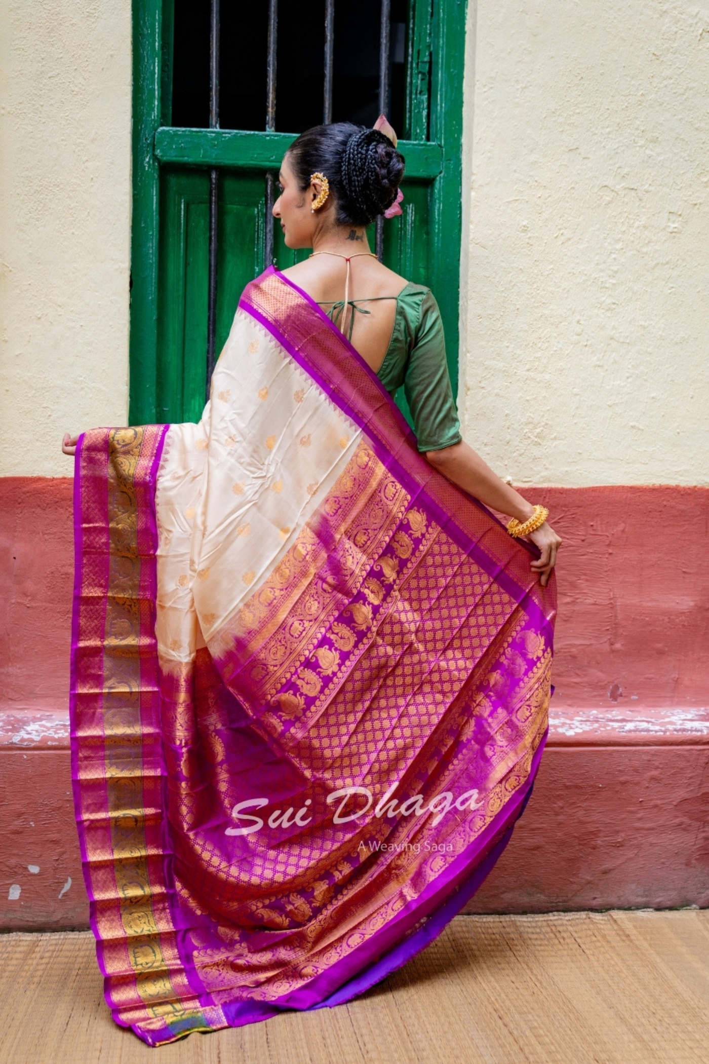 An exquisite handcrafted treasure from the Gadwal collection, this pure silk saree features a finely detailed designer border adorned with elegant peacock motifs, beautifully complemented by a striking contrast pallu. Each weave showcases the skill and artistry of Gadwal craftsmanship, blending tradition with contemporary elegance. Perfect for weddings, festive occasions, and cultural celebrations, this saree embodies timeless sophistication, heritage charm, and heirloom-worthy allure.