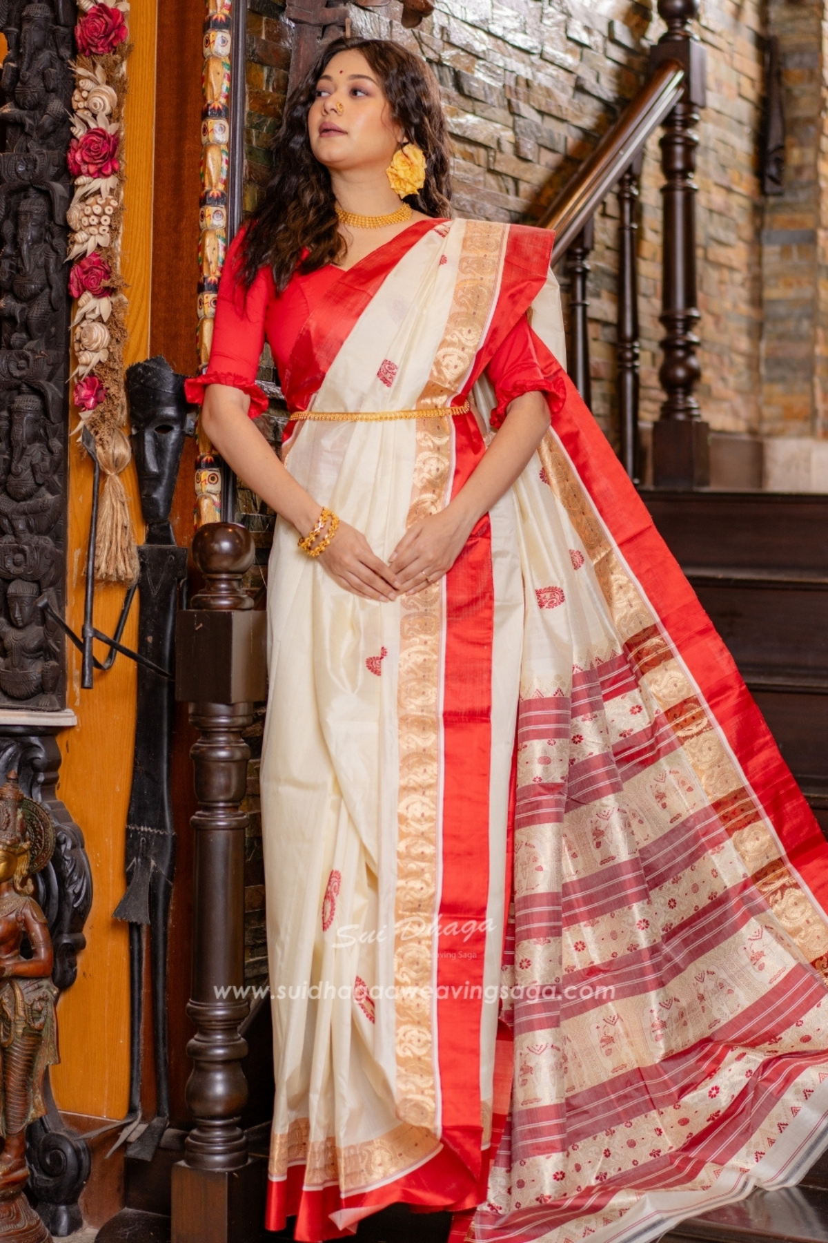 A distinguished masterpiece from the Garod collection, this exclusively handcrafted pure silk saree features the signature red border that symbolizes grace and tradition. The lustrous silk body, paired with the classic contrasting edge, reflects the timeless artistry of Bengal’s weaving heritage. Perfect for weddings, festive occasions, and cultural celebrations, this saree embodies purity, elegance, and heritage craftsmanship, making it a cherished addition to any heirloom-worthy collection.