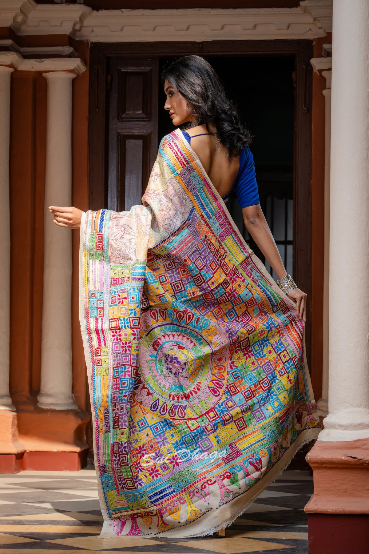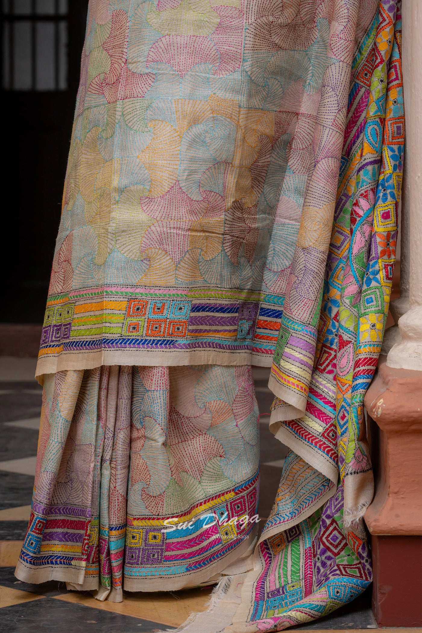 Handcrafted Kantha stitch on Pure Silk saree