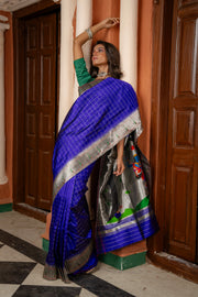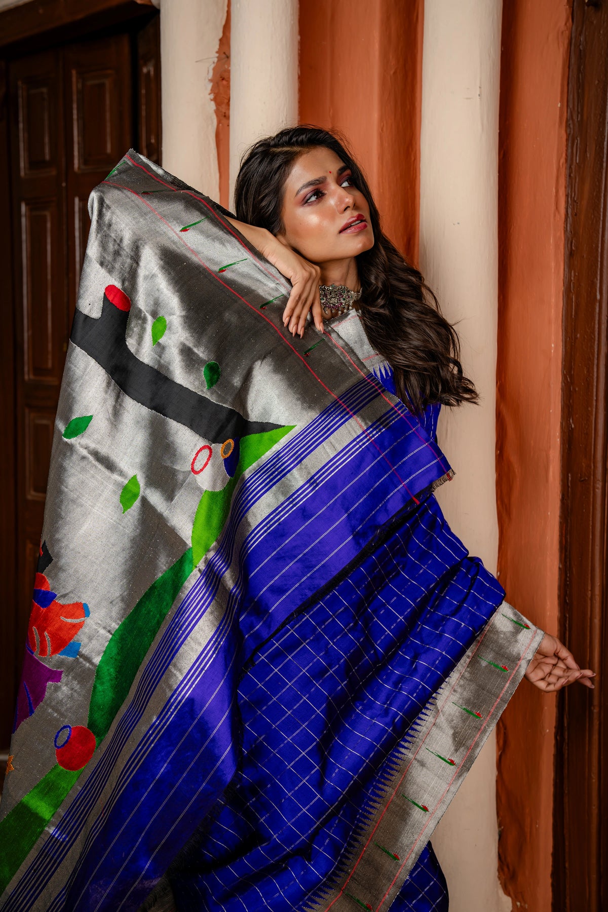 Handloom Pure Silk Silver Zari Muniya Border with Exclusive Radha Krishna Pallu in Royal Blue