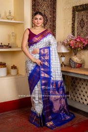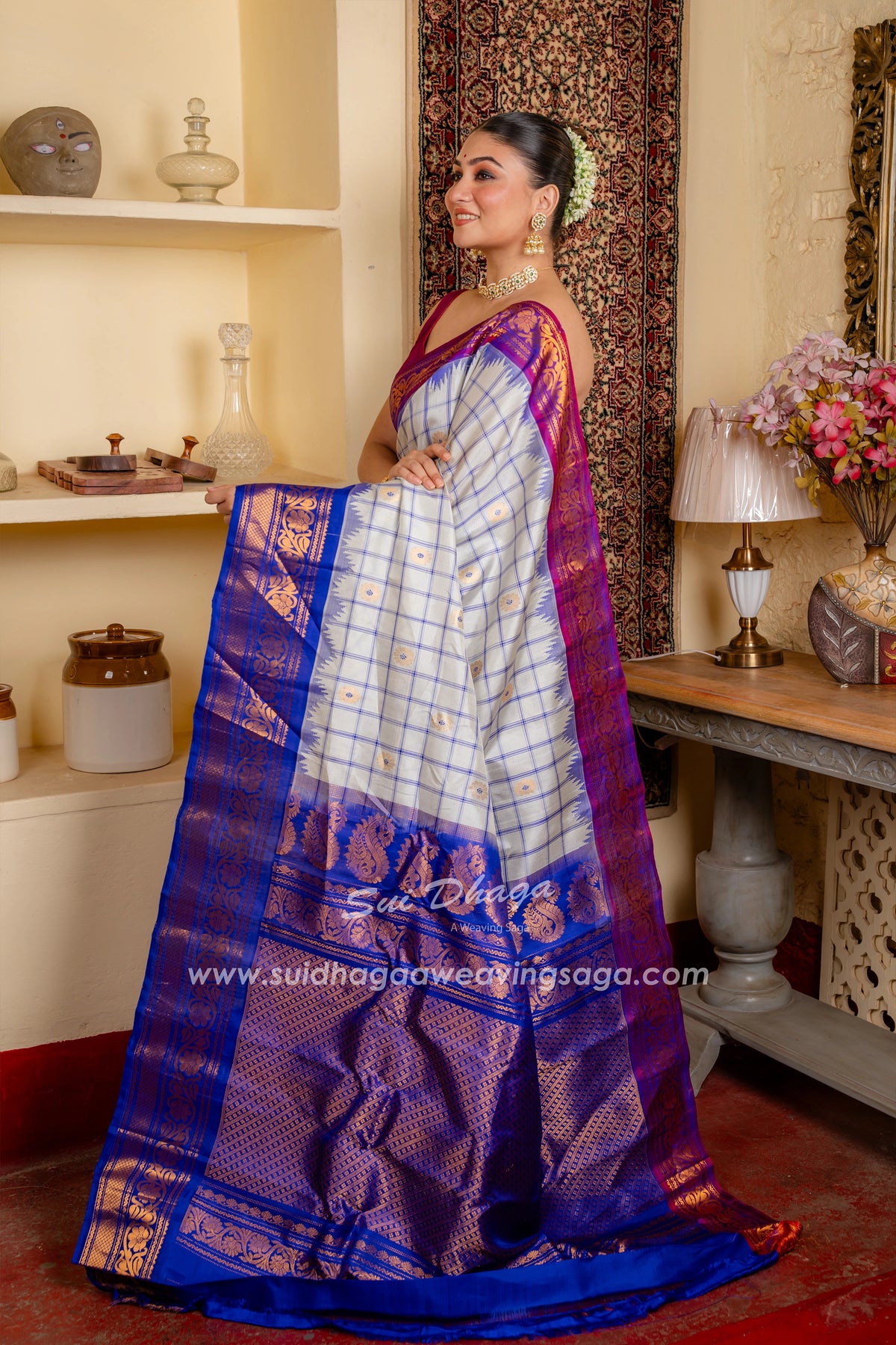 Crafted with intricate zari work and broad checks the Blue and White Gadwal Sari is a classic piece. The dual...