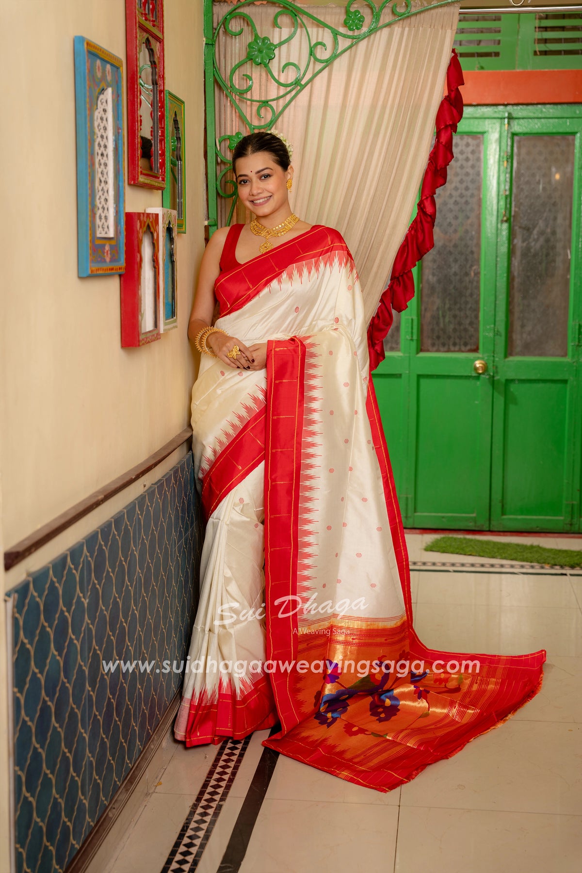 A red white muniya paithani can worn for #pongalcelebration to usher in new beginnings with a happy heart and blessings...