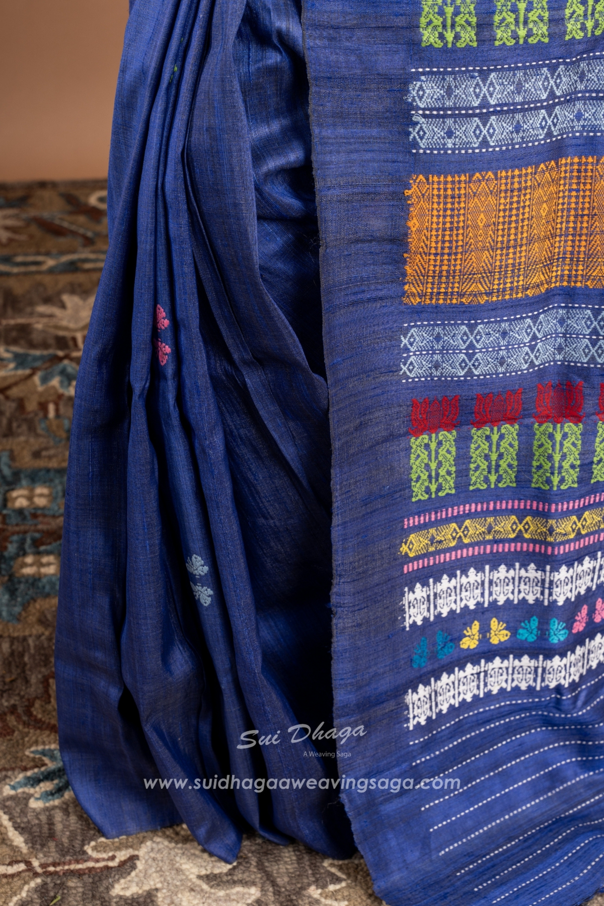 A distinguished piece from the Gopalpur Tussar collection, this handcrafted saree comes alive in a deep ink blue hue, woven...