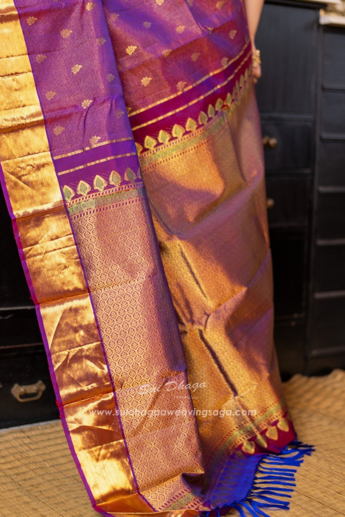 A resplendent handloom treasure from the Kanchipuram collection, this pure silk saree in regal purple is adorned with delicate tiny...