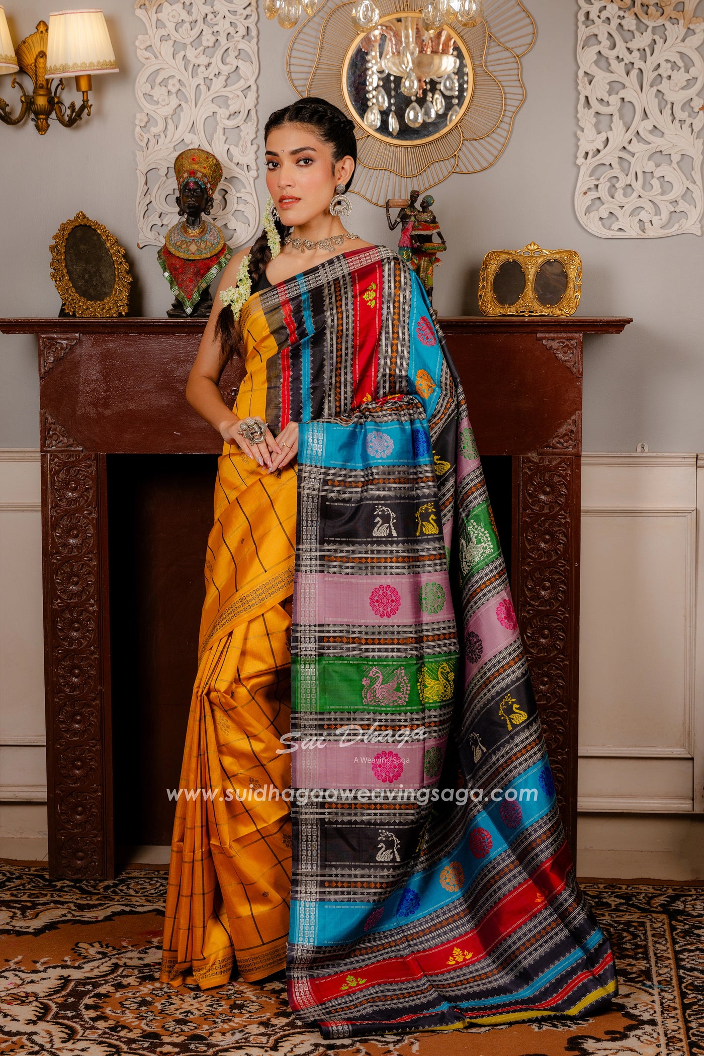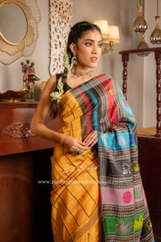 Mustard yellow Coloured Checkered Pure Silk DOUBLE Pallu Berhampuri saree
