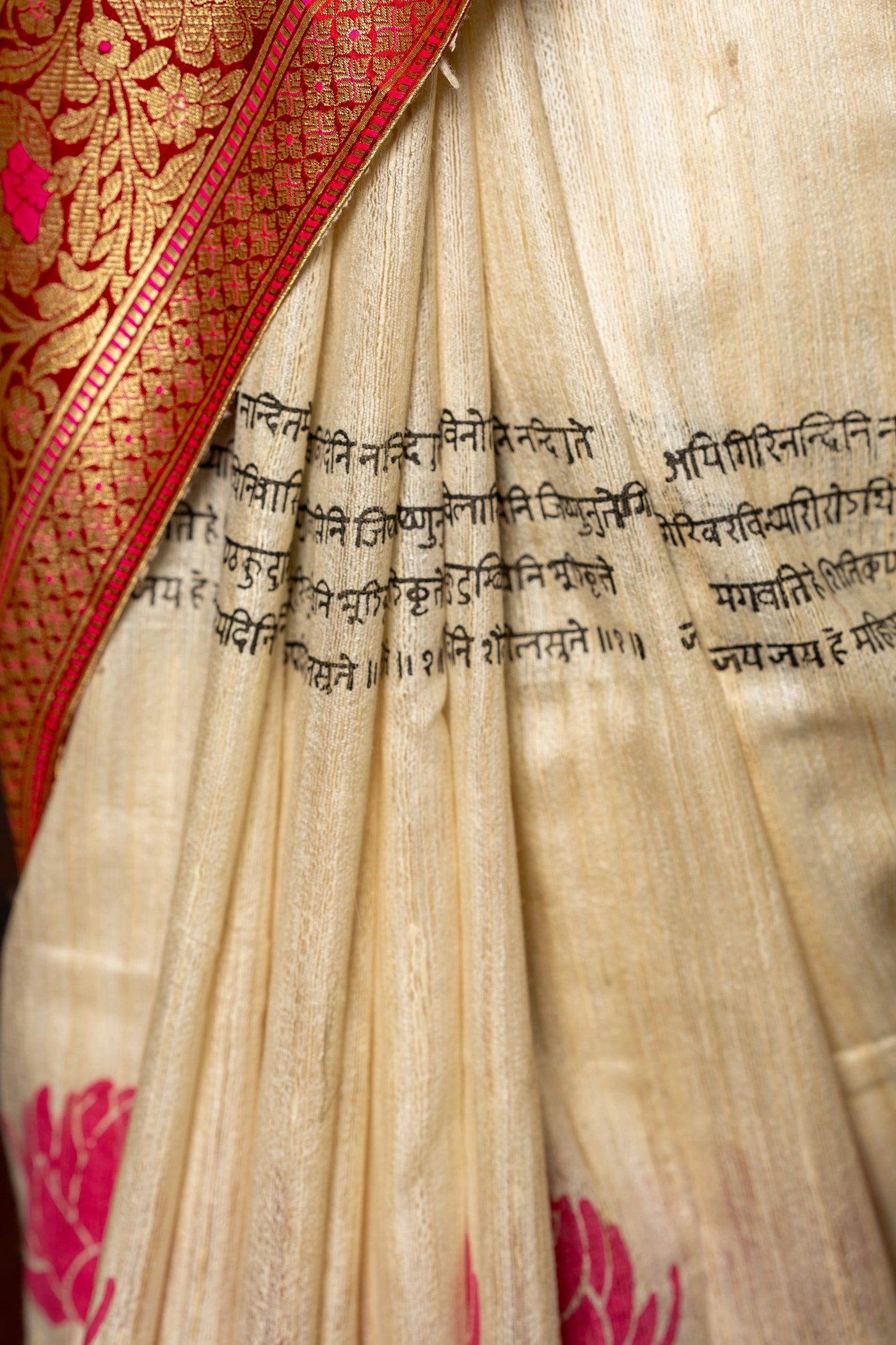 A Pure Gachi Silk with block prints on the body and Banarasi border on the edges. The palla and the...