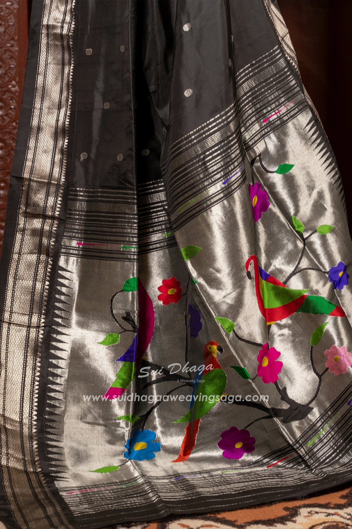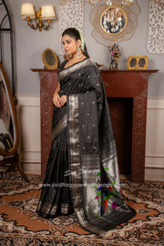 Silver Zari Parrot Pallu Handwoven Pure silk Paithani